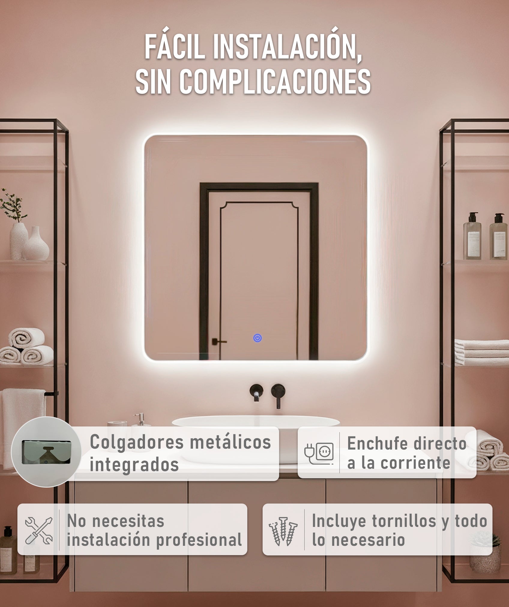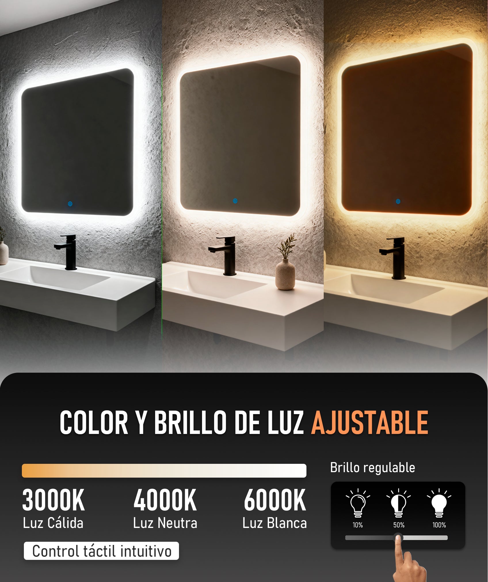 Ajusta la temperatura de color entre cálida (3000K), neutra (4000K) o fría (6000K), con una durabilidad de hasta 50.000 horas. Ilumina con precisión tus sesiones de maquillaje y rutinas de cuidado personal.