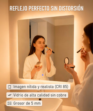 Fabricado con vidrio de alta calidad, ofrece una superficie plana que refleja con precisión, sin distorsiones ni zonas borrosas. Con un índice de reproducción cromática (CRI) de 85, permite apreciar los colores con gran fidelidad.