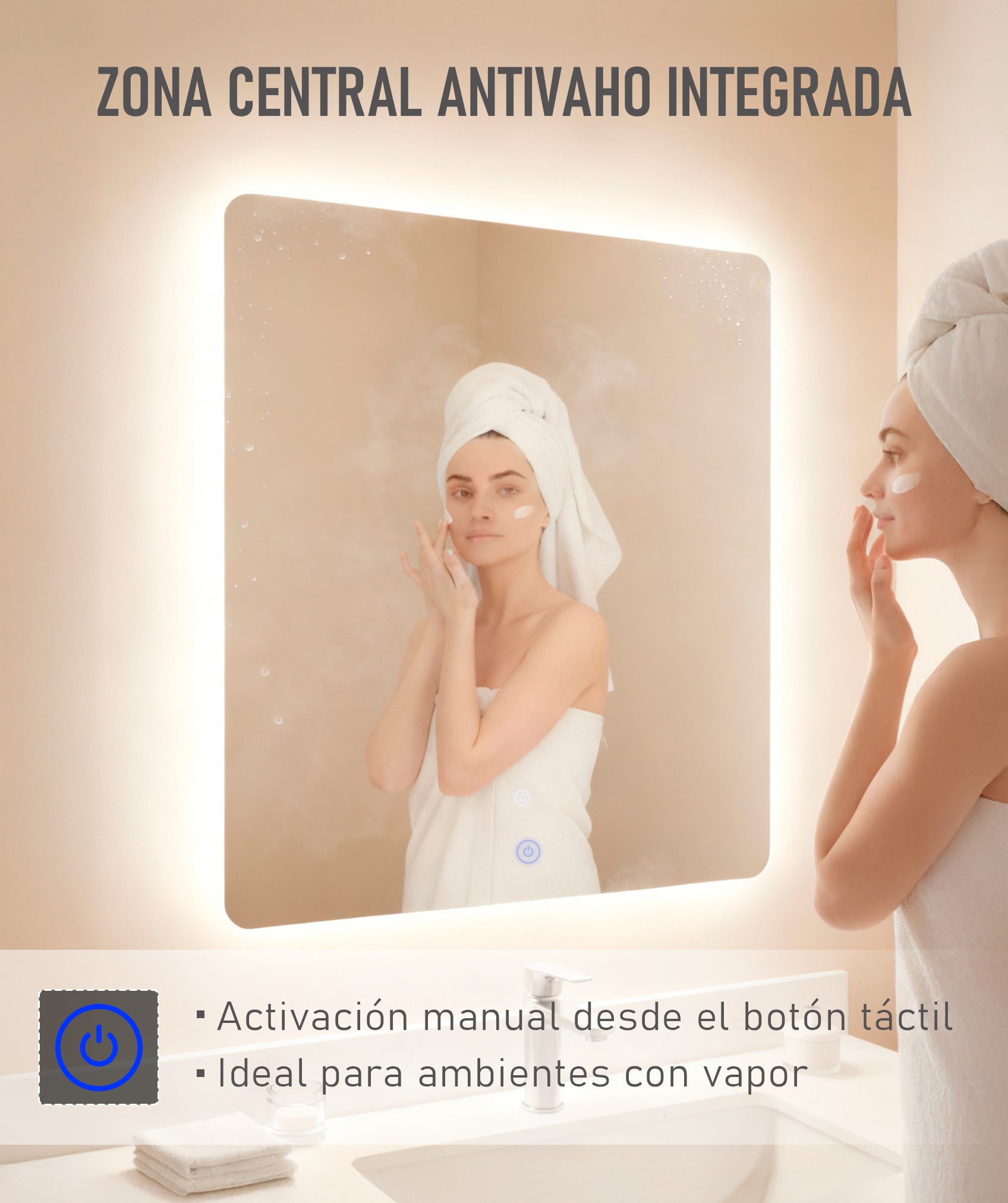 La función antivaho impide la formación de condensación, empañamiento o niebla sobre la superficie, manteniendo una visibilidad óptima incluso en ambientes con alta humedad.