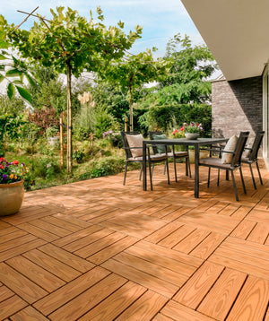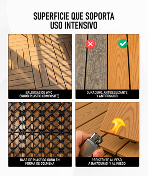 Las losas combinan un 60 % de plástico PE, 30 % de polvo de madera y 10 % de aditivos. Ofrecen el acabado cálido de la madera con la resistencia del polímero, ideales para zonas de mucho uso. La superficie antideslizante proporciona una pisada segura, incluso en ambientes húmedos.