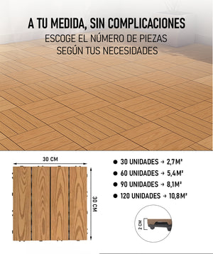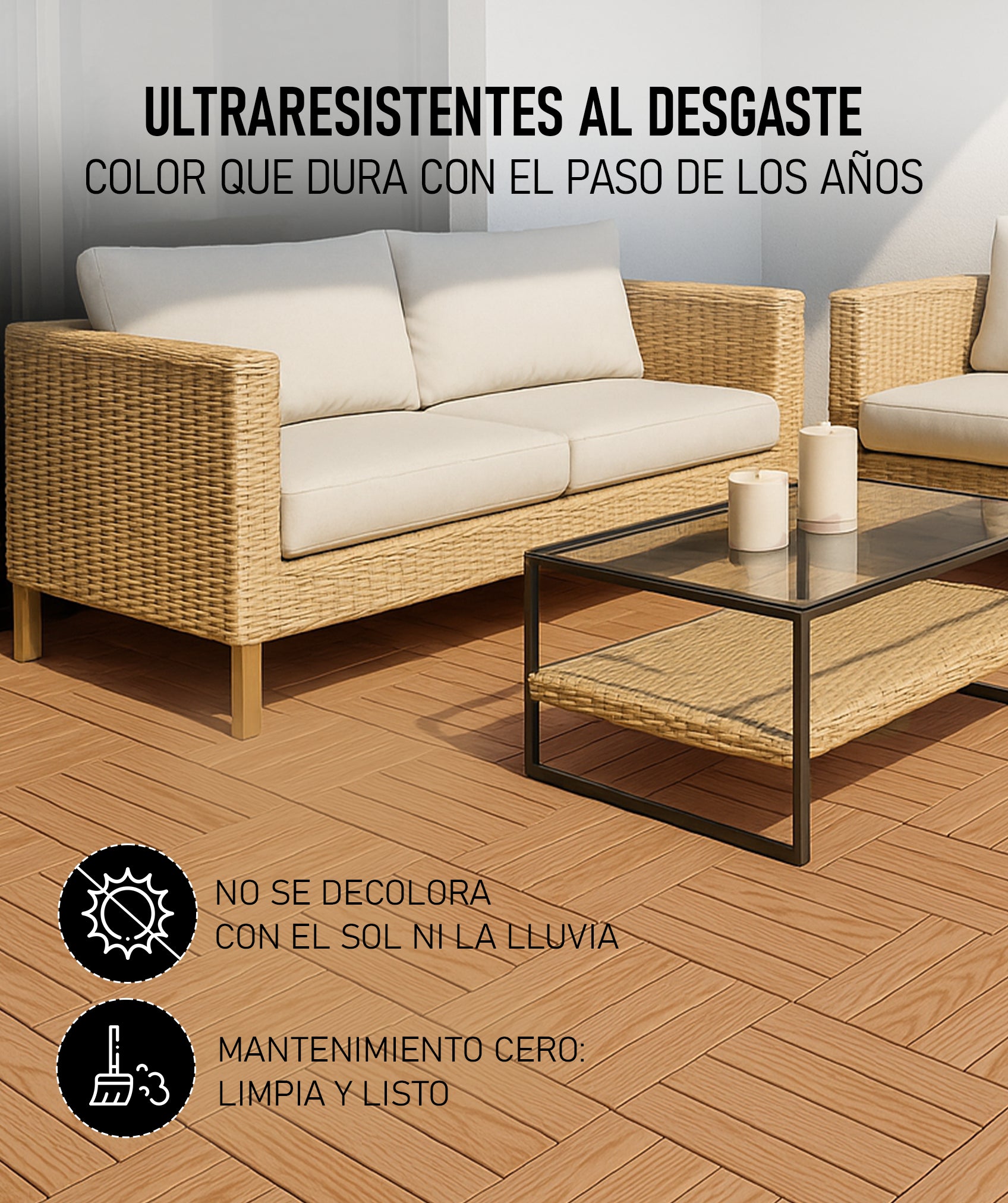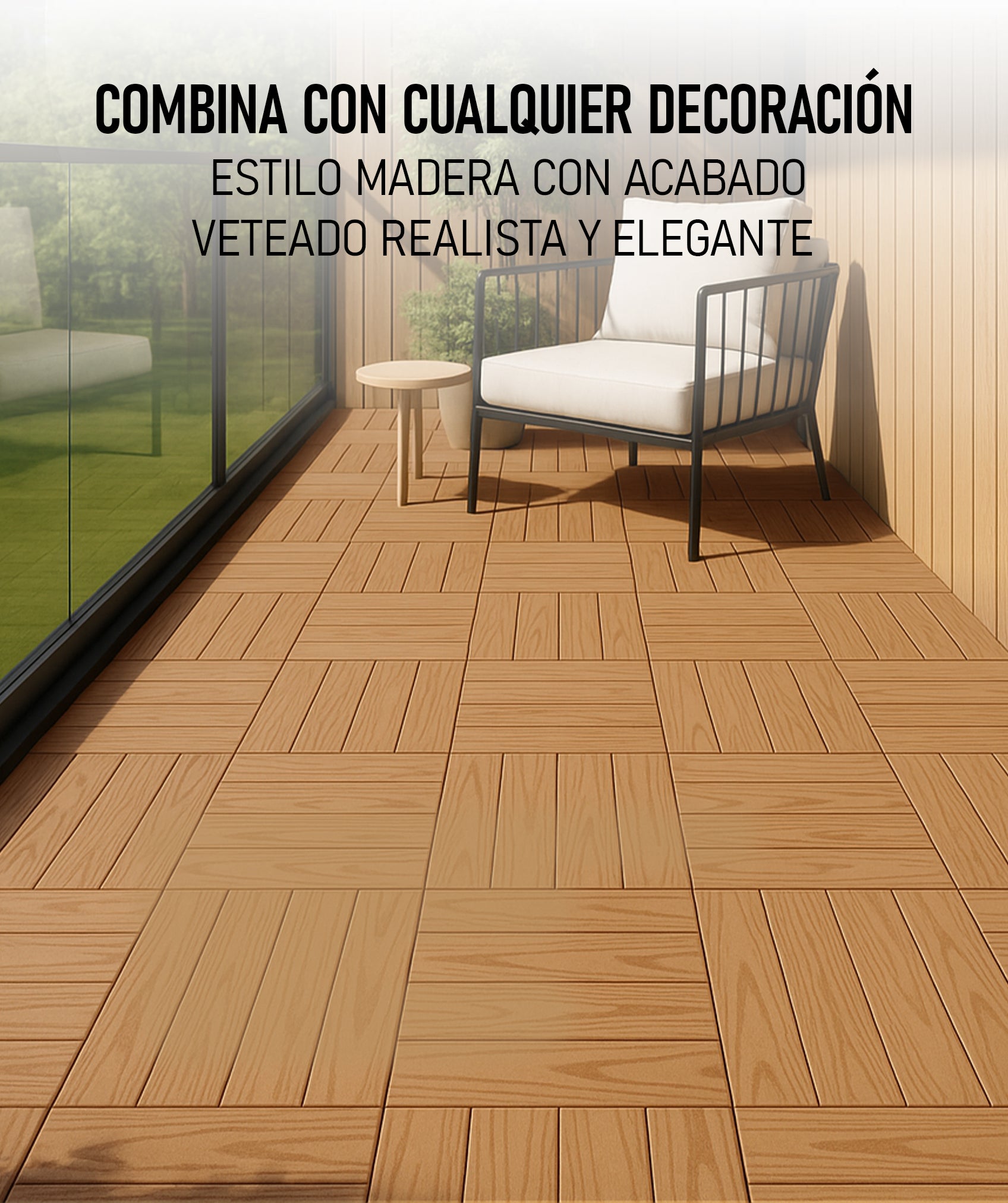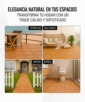 Aptas para interiores y exteriores: terrazas, balcones, jardines, patios o baños, conservan su estética natural con una limpieza básica. No necesitan barnices, lijado ni productos especiales.