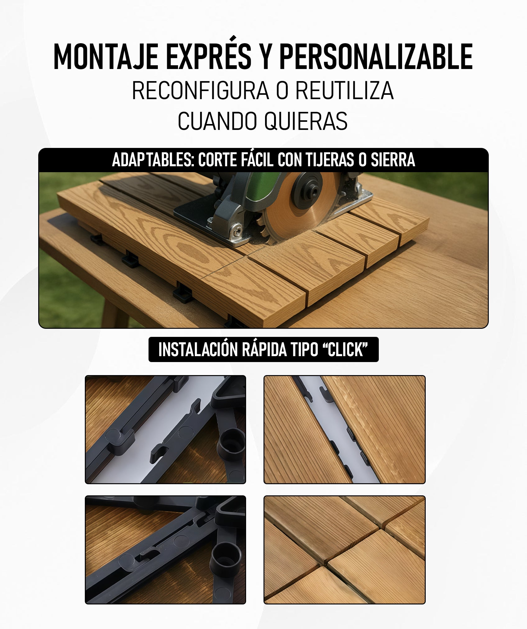 Las baldosas se ensamblan con facilidad mediante un mecanismo que no necesita herramientas. Los bordes pueden ajustarse con cortes limpios para adaptarse a esquinas, curvas o desniveles. Se instalan directamente sobre cualquier superficie, sin obras ni experiencia previa.