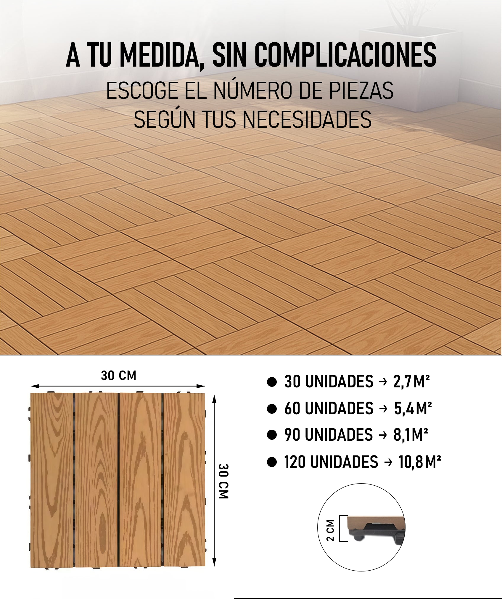 Cada pieza mide 30 × 30 cm con un grosor de 2 cm. El formato cuadrado permite crear combinaciones personalizadas: patrones geométricos, tramas cruzadas o diseños en espiga. Una forma sencilla de conseguir suelos únicos con un acabado sofisticado.
